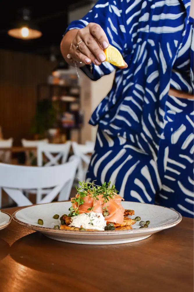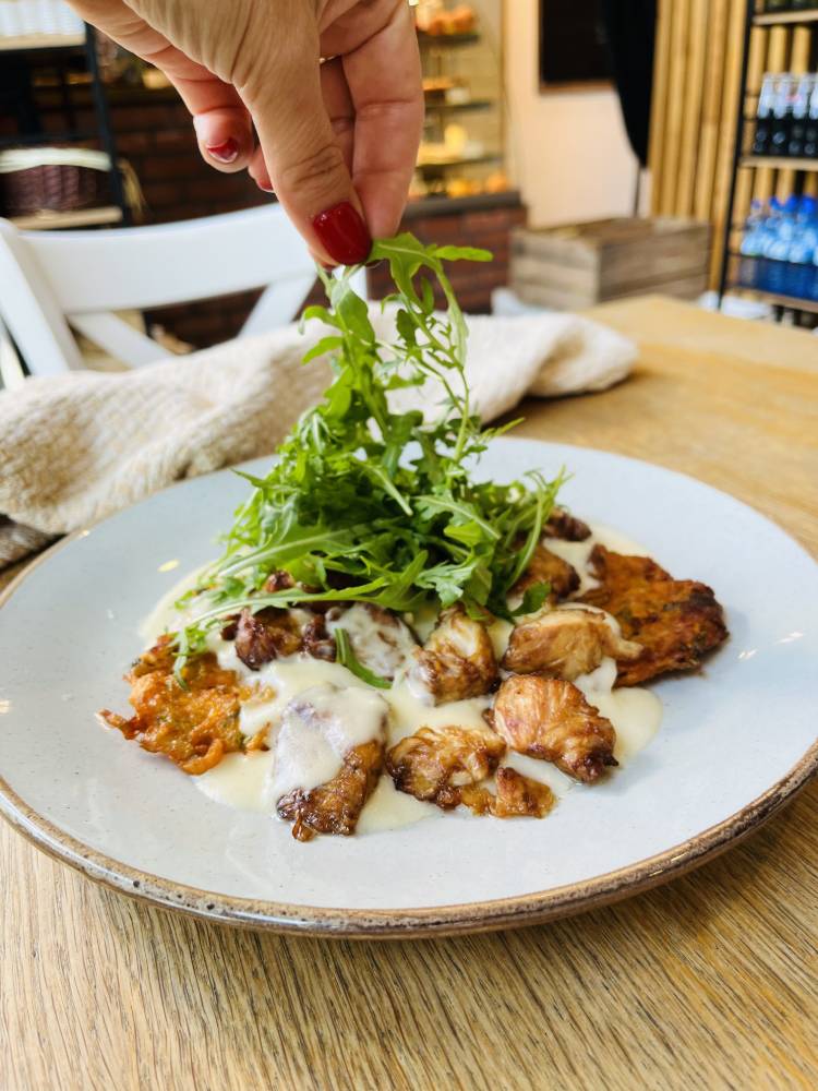 Nie wykluczamy nietypowych połączeń. Chrupiące placki marchewkowe, kremowy sos cytrynowy, marynowany kurczak i aromatyczna rukola. To danie gości u nas od początku.