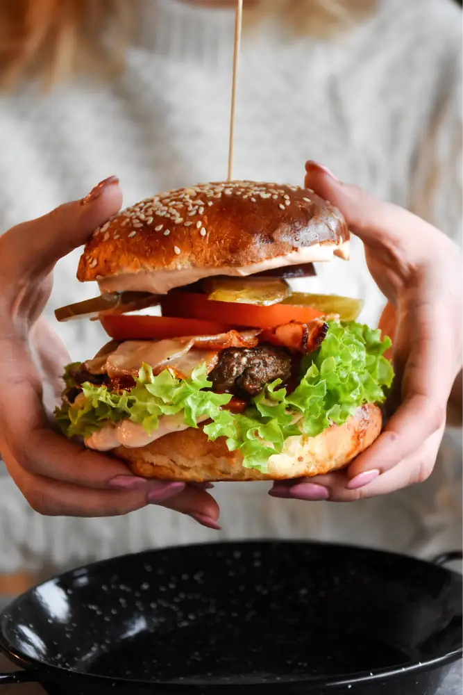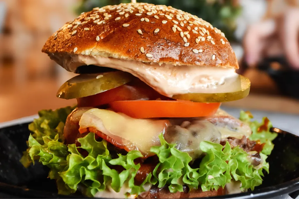 ze świeżo mieloną 100% wołowiną – od Kuby naszego lokalnego sprawdzonego dostawcy, bekonem, serem żółtym, pomidorem, kiszonym ogórkiem, czerwoną cebulą, sosem BBQ na wędzonych śliwkach naszej roboty podany z okienkami