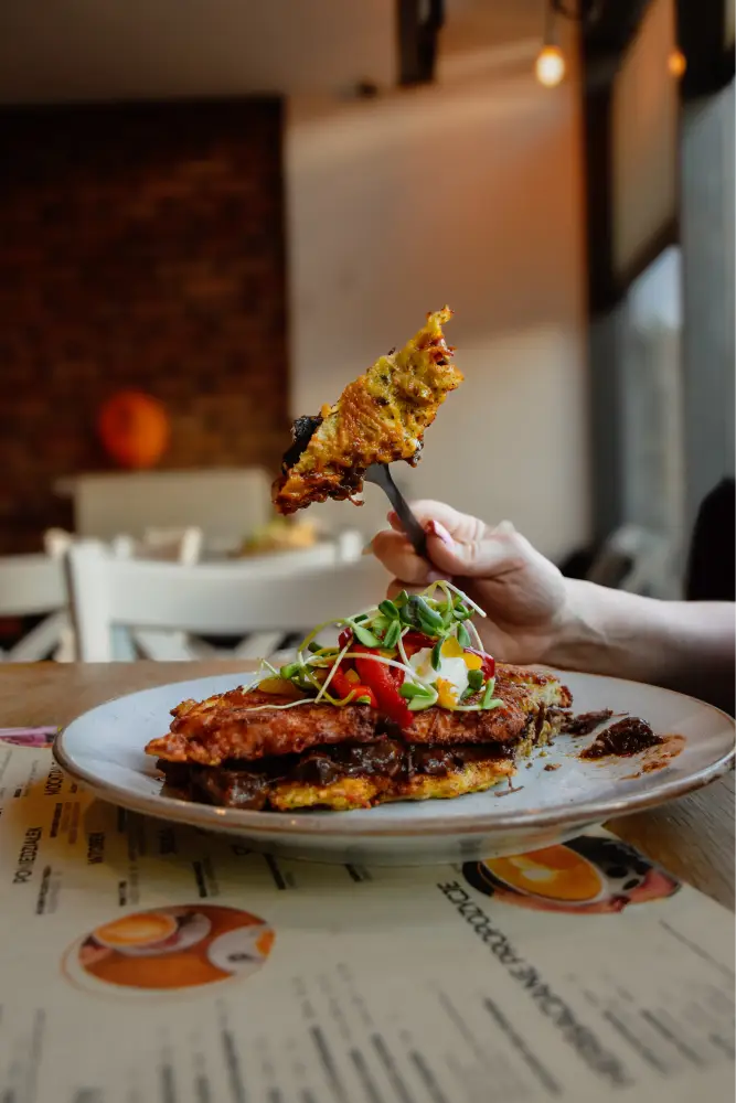 pankejki (2szt.) podane z salsą pomidorowo-bazyliową z czosnkiem, grillowanym boczkiem z wędzarni od Pana Witka, ekologicznym jajem sadzonym, rukolą i szczypiorem (dostępna wersja wegetariańska – z chrupiącymi boczniakami w ryżowej panierce)