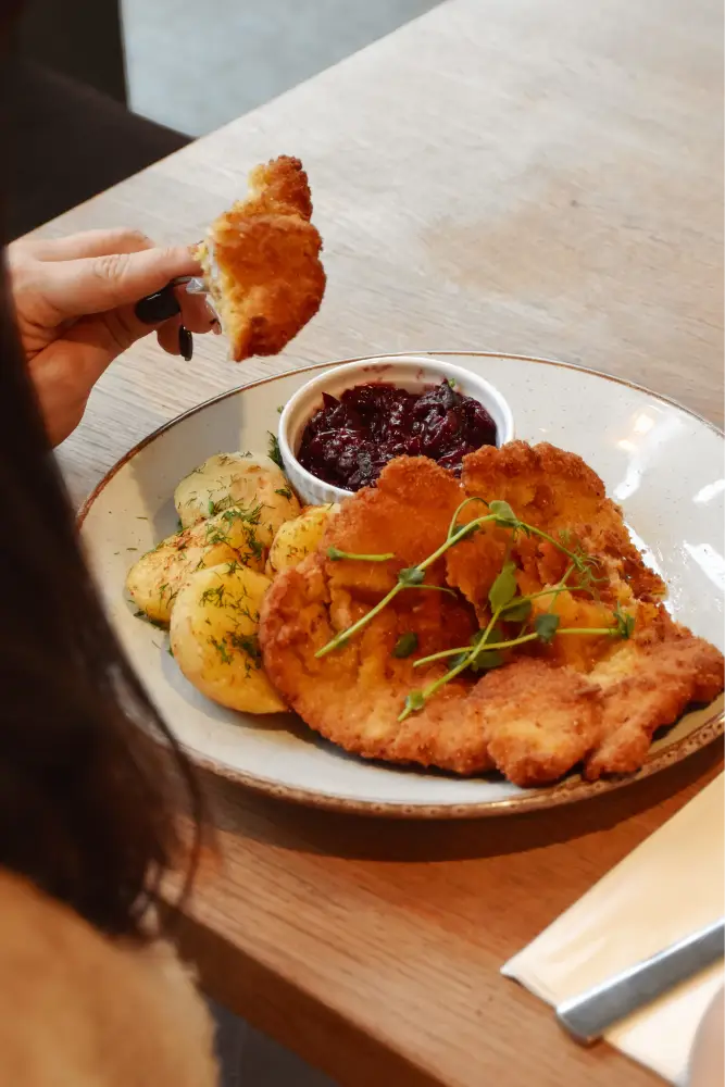 Nasz kotlet schabowy marynowany jest w świeżej bazylii, rozmarynie i czosnku. Stawiamy na sezonowość, dlatego w zależności od pory roku dostaniesz go z innym dodatkiem.