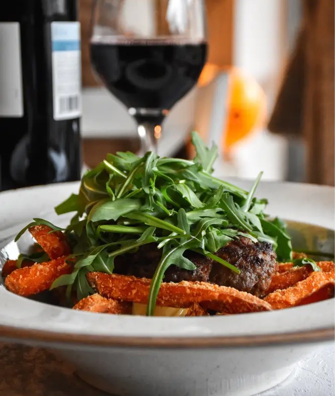 serwowany na frytkach z batatów z sosem piri-piri oraz rukolą