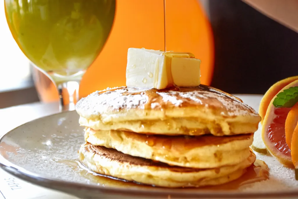 pankejki (3 szt.) podane klasycznie z masłem, syropem klonowym, cukrem pudrem i owocami