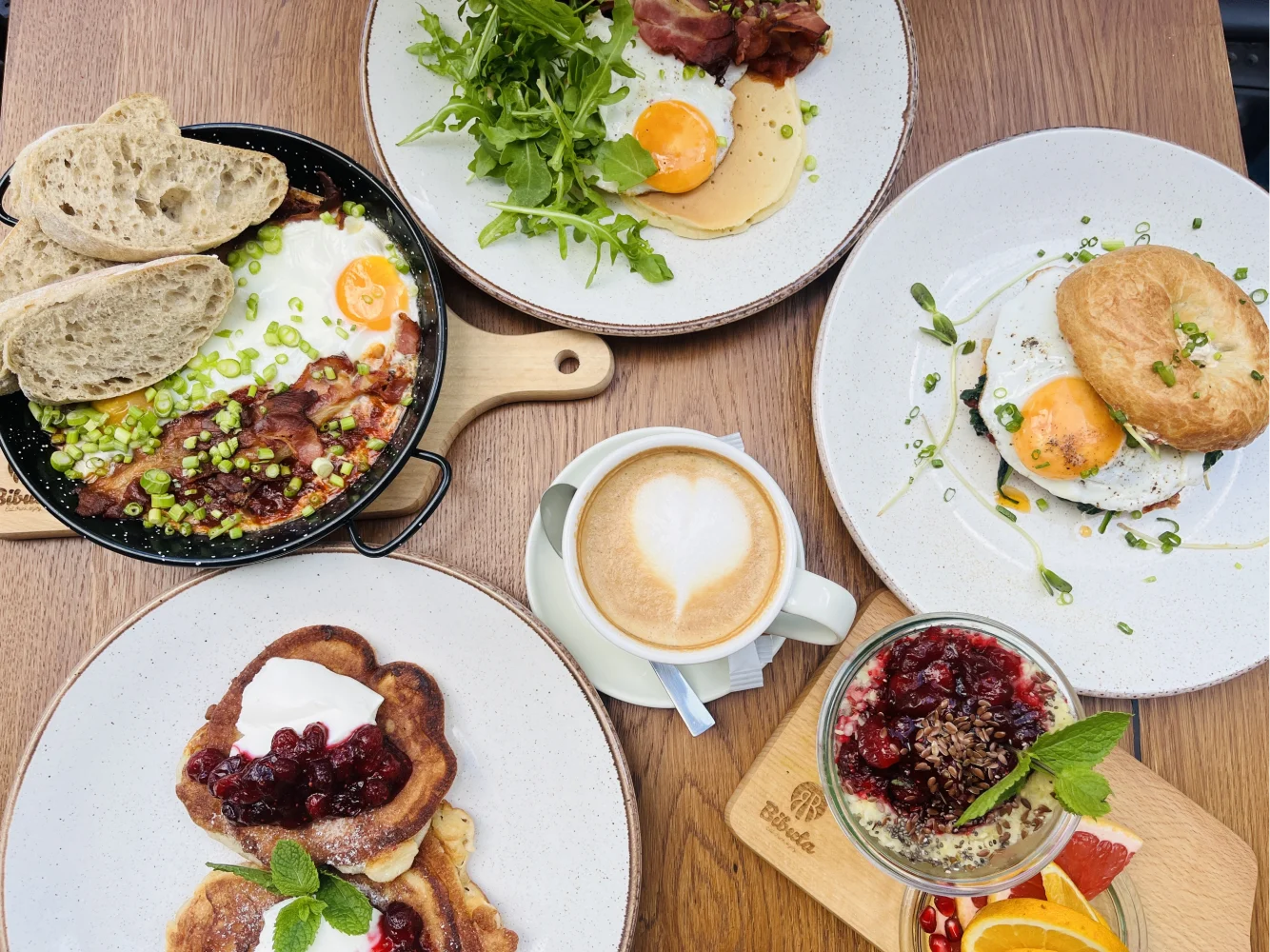 pankejki (2szt.) podane z salsą pomidorowo-bazyliową z czosnkiem, grillowanym boczkiem z wędzarni od Pana Witka, ekologicznym jajem sadzonym, rukolą i szczypiorem (dostępna wersja wegetariańska – z chrupiącymi boczniakami w ryżowej panierce)
