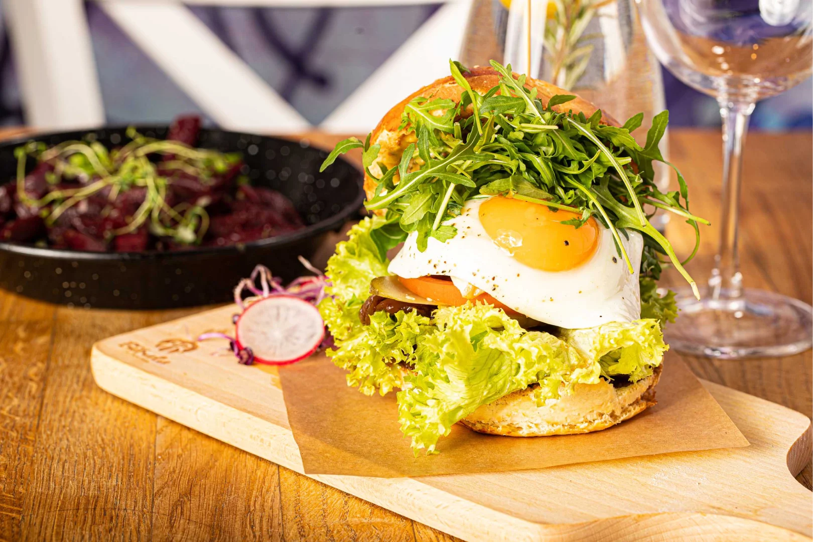 Nasz kotlet schabowy marynowany jest w świeżej bazylii, rozmarynie i czosnku. Stawiamy na sezonowość, dlatego w zależności od pory roku dostaniesz go z innym dodatkiem.