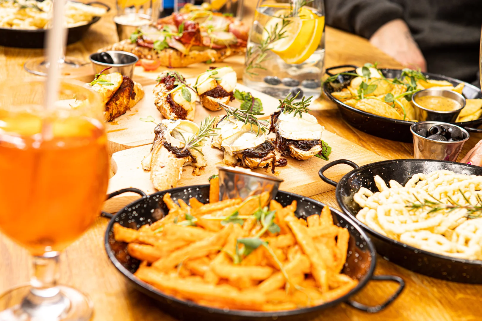 serwowany na frytkach z batatów z sosem piri-piri oraz rukolą