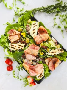 - Pasztet z gęsiną naszej produkcji/masło/żurawina/rukola 56,-
