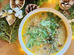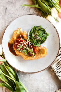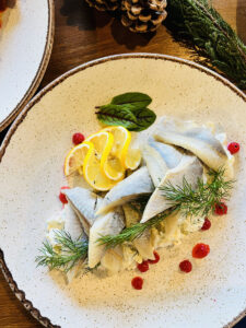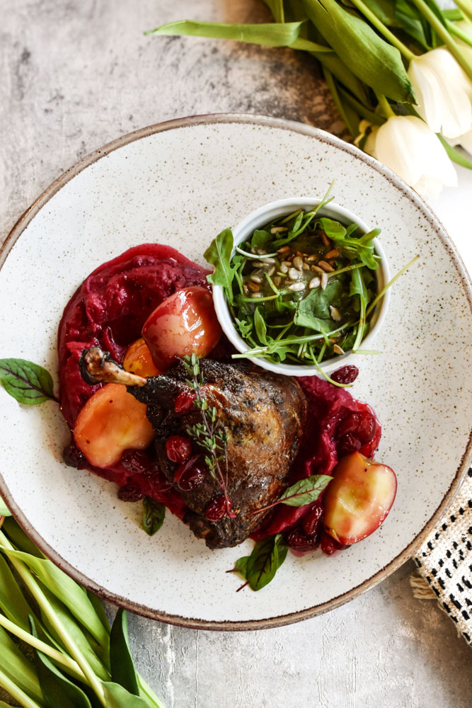 Pieczone udo kacze z domową konfiturą z żurawiny oraz jabłkiem podane z modrą kapustą z rodzynkami