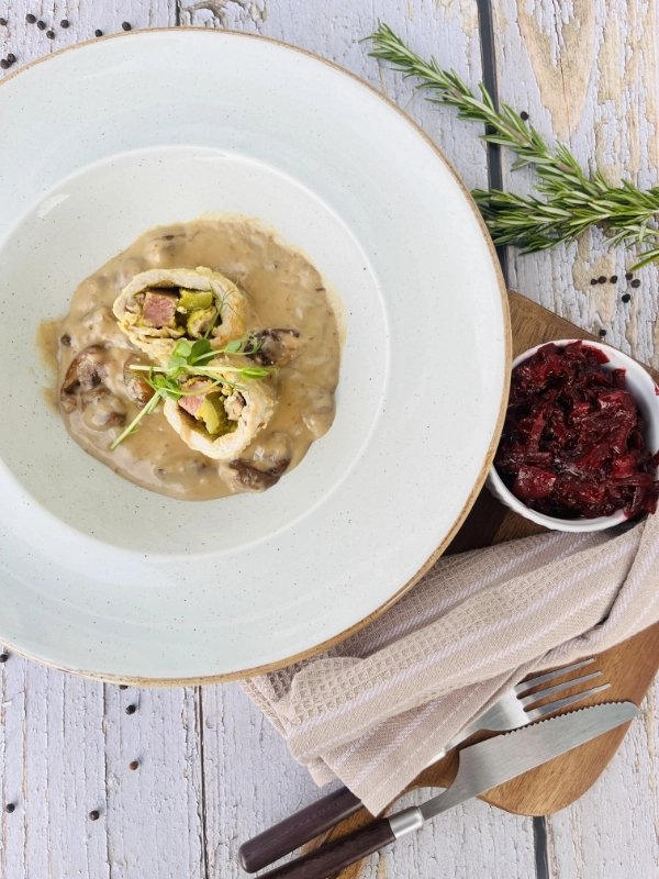 Zraz wieprzowy z sosem grzybowym i buraczkami (porcja z dodatkami około 500g)