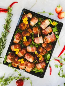 Roladki z grillowanego boczku z wędzoną śliwką podane na aromatycznej rukoli 20 szt.