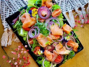 Sałata z wędzonym łososiem ze szpinakiem, pomidorkami cherry, pestkami słonecznika, czerwoną cebulą, rzodkiewką, liśćmi świeżej mięty i dressingiem malinowym /porcja…
